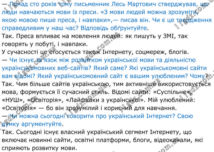 — Понад сто років тому письменник Лесь Мартович стверджував, що люди навчаються мови із преси. «З мови людей можна зрозуміти, якою мовою пише преса, і навпаки»,— писав він. Чи є це твердження справедливим у наш час? Відповідь обґрунтуйте. Так. Преса впливає на мовлення людей: як пишуть у ЗМІ, так говорять у побуті, і навпаки. У сучасності це стосується також Інтернету, соцмереж, блогів. — Чи існує зв’язок між розвитком української мови та діяльністю українськомовних веб-сайтів? Який саме? Які українськомовні сайти вам відомі? Який українськомовний сайт є вашим улюбленим? Чому? Так. Чим більше сайтів українською, тим активніше використовується мова, формується її сучасний стиль. Відомі сайти: «Суспільне», «НУШ», «Освіторія», «Лайфхаки з української». Мій улюблений: «Освіторія» — бо він зрозумілий і корисний для навчання. — Чи можна сьогодні говорити про український Інтернет? Свою думку аргументуйте. Так. Сьогодні існує власний український сегмент Інтернету, що включає новинні сайти, освітні платформи, блоги, відеоканали, які сприяють розвитку мови.