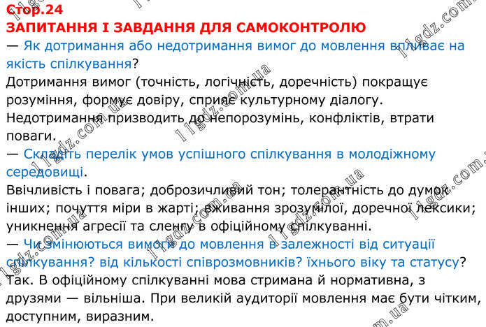 ЗАПИТАННЯ І ЗАВДАННЯ ДЛЯ САМОКОНТРОЛЮ — Як дотримання або недотримання вимог до мовлення впливає на якість спілкування? Дотримання вимог (точність, логічність, доречність) покращує розуміння, формує довіру, сприяє культурному діалогу. Недотримання призводить до непорозумінь, конфліктів, втрати поваги. — Складіть перелік умов успішного спілкування в молодіжному середовищі. Ввічливість і повага; доброзичливий тон; толерантність до думок інших; почуття міри в жарті; вживання зрозумілої, доречної лексики; уникнення агресії та сленгу в офіційному спілкуванні. — Чи змінюються вимоги до мовлення в залежності від ситуації спілкування? від кількості співрозмовників? їхнього віку та статусу? Так. В офіційному спілкуванні мова стримана й нормативна, з друзями — вільніша. При великій аудиторії мовлення має бути чітким, доступним, виразним.