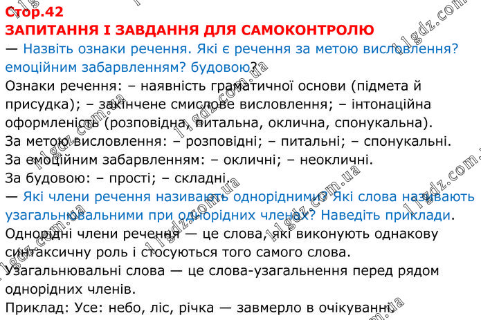 ЗАПИТАННЯ І ЗАВДАННЯ ДЛЯ САМОКОНТРОЛЮ — Назвіть ознаки речення. Які є речення за метою висловлення? емоційним забарвленням? будовою? Ознаки речення: – наявність граматичної основи (підмета й присудка); – закінчене смислове висловлення; – інтонаційна оформленість (розповідна, питальна, оклична, спонукальна). За метою висловлення: – розповідні; – питальні; – спонукальні. За емоційним забарвленням: – окличні; – неокличні. За будовою: – прості; – складні. — Які члени речення називають однорідними? Які слова називають узагальнювальними при однорідних членах? Наведіть приклади. Однорідні члени речення — це слова, які виконують однакову синтаксичну роль і стосуються того самого слова. Узагальнювальні слова — це слова-узагальнення перед рядом однорідних членів. Приклад: Усе: небо, ліс, річка — завмерло в очікуванні.
