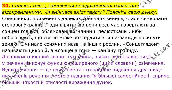 Спишіть текст, замінюючи невідокремлені означення відокремленими. Чи змінився зміст тексту? Поясніть свою думку. Соняшники, привезені з далеких сонячних земель, стали символами степової України. Люди вірять, що вони весь час повертають за сонцем голівки, облямовані вогняними пелюстками , ніби побоюючись, що світло може розсердитися й назавжди покинути землю. Є чимало сонячних назв і в інших рослин. «Сонцеглядом» називають цикорій, а «сонцецвітом» — кам’яну троянду. Дієприкметниковий зворот (усі слова, з яких він складається) у реченні виконує функцію поширеного (цими словами) означення. Відокремлення — це смислове та інтонаційне виділення другоряд– них членів речення з метою надання їм більшої самостійності, сприяє більшій чіткості й стислості вираження думок.