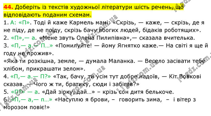 Доберіть із текстів художньої літератури шість речень, що відповідають поданим схемам. 1. А: «П». Тоді й каже Кармель мамі: «Скрізь, — каже, — скрізь, де я не піду, де не поїду, скрізь бачу вбогих людей, бідаків роботящих». 2. «П»,— а. «Мене звуть Олена Пилипівна»,— сказала вчителька. 3. «П,— а.— П…» «Помилуйте! — йому Ягнятко каже.— На світі я ще й году не прожив». «Яка ти розкішна, земле, — думала Маланка. — Весело засівати тебе хлібом, прикрашати зелом». 4. «П,— а.— П?» «Так, бачу, ти усім тут добре надоїв, — Кіт Вовкові сказав. — Чого ж ти, братику, сюди і забігав?» 5. «П?» — а. «Дай зірку, дай…» – крізь сон дитя белькоче. 6. «П,— а,— п…» «Насуплю я брови, – говорить зима, – і вітер з морозом повіє!»
