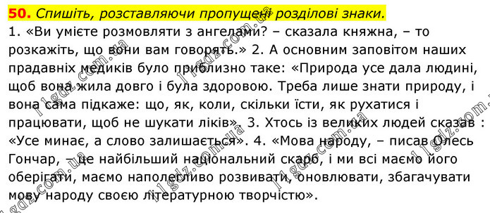 Спишіть, розставляючи пропущені розділові знаки. 1. «Ви умієте розмовляти з ангелами? – сказала княжна, – то розкажіть, що вони вам говорять.» 2. А основним заповітом наших прадавніх медиків було приблизно таке: «Природа усе дала людині, щоб вона жила довго і була здоровою. Треба лише знати природу, і вона сама підкаже: що, як, коли, скільки їсти, як рухатися і працювати, щоб не шукати ліків». 3. Хтось із великих людей сказав : «Усе минає, а слово залишається». 4. «Мова народу, – писав Олесь Гончар, – це найбільший національний скарб, і ми всі маємо його оберігати, маємо наполегливо розвивати, оновлювати, збагачувати мову народу своєю літературною творчістю».