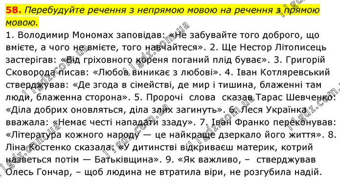 Перебудуйте речення з непрямою мовою на речення з прямою мовою. 1. Володимир Мономах заповідав: «Не забувайте того доброго, що вмієте, а чого не вмієте, того навчайтеся». 2. Ще Нестор Літописець застерігав: «Від гріховного кореня поганий плід буває». 3. Григорій Сковорода писав: «Любов виникає з любові». 4. Іван Котляревський стверджував: «Де згода в сімействі, де мир і тишина, блаженні там люди, блаженна сторона». 5. Пророчі слова сказав Тарас Шевченко: «Діла добрих оновляться, діла злих загинуть». 6. Леся Українка вважала: «Немає честі нападати ззаду». 7. Іван Франко переконував: «Література кожного народу — це найкраще дзеркало його життя». 8. Ліна Костенко сказала: «У дитинстві відкриваєш материк, котрий назветься потім — Батьківщина». 9. «Як важливо, – стверджував Олесь Гончар, – щоб людина не втратила віри, не розгубила надій.