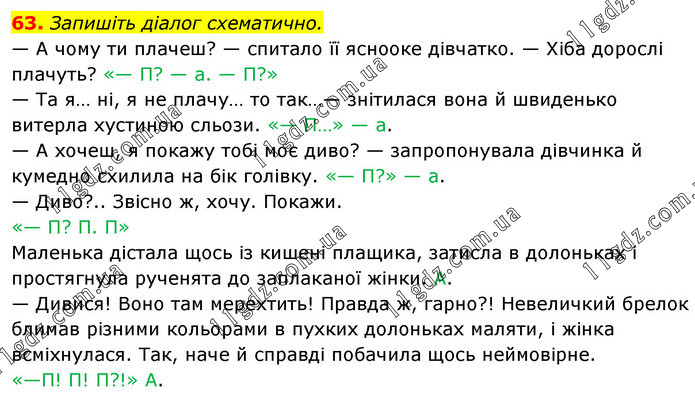 Запишіть діалог схематично. — А чому ти плачеш? — спитало її яснооке дівчатко. — Хіба дорослі плачуть? «— П? — а. — П?» — Та я… ні, я не плачу… то так…— знітилася вона й швиденько витерла хустиною сльози. «— П…» — а. — А хочеш, я покажу тобі моє диво? — запропонувала дівчинка й кумедно схилила на бік голівку. «— П?» — а. — Диво?.. Звісно ж, хочу. Покажи. «— П? П. П» Маленька дістала щось із кишені плащика, затисла в долоньках і простягнула рученята до заплаканої жінки. А. — Дивися! Воно там мерехтить! Правда ж, гарно?! Невеличкий брелок блимав різними кольорами в пухких долоньках маляти, і жінка всміхнулася. Так, наче й справді побачила щось неймовірне. «—П! П! П?!» А.