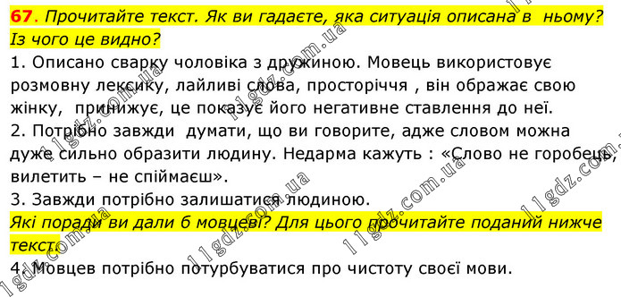 Прочитайте текст. Як ви гадаєте, яка ситуація описана в ньому? Із чого це видно? 1. Описано сварку чоловіка з дружиною. Мовець використовує розмовну лексику, лайливі слова, просторіччя , він ображає свою жінку, принижує, це показує його негативне ставлення до неї. 2. Потрібно завжди думати, що ви говорите, адже словом можна дуже сильно образити людину. Недарма кажуть : «Слово не горобець, вилетить – не спіймаєш». 3. Завжди потрібно залишатися людиною. Які поради ви дали б мовцеві? Для цього прочитайте поданий нижче текст. 4. Мовцев потрібно потурбуватися про чистоту своєї мови.