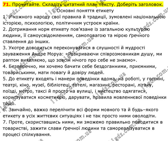Прочитайте. Складіть цитатний план тексту. Доберіть заголовок. Основні поняття етикету 1. У кожного народу свої правила й традиції, зумовлені національною історією, психологією, політичним устроєм країни. 2. Дотримання норм етикету пов’язане із загальною культурою людини, її самоусвідомленням, самоповагою та мірою ґречного ставлення до інших. 3. Укотре доводиться переконуватися в слушності й мудрості зауваження Андре Моруа: «Розкриваючи співрозмовникам душу, ми раптом виявляємо, що зовсім нічого про себе не знаємо». 4. Безперечно, ми хочемо бачити себе бездоганними, приємними, товариськими, мати повагу й довіру людей. 5. До етикету входять і манери поведінки вдома, на роботі, у гостині, театрі, кіно, музеї, бібліотеці, готелі, магазині, ресторані, літаку, поїзді, метро, таксі й просто на вулиці, і мистецтво одягатися, користуватися косметикою, дарувати, правила мовленнєвої поведінки тощо. 6. Звичайно, важко перелічити всі форми мовного та й будь–якого етикету в усіх життєвих ситуаціях і не так просто ними оволодіти. 7. Проте, скориставшись ними, ми зможемо правильно поводитися в товаристві, зажити слави ґречної людини та самореалізуватися в процесі спілкування.