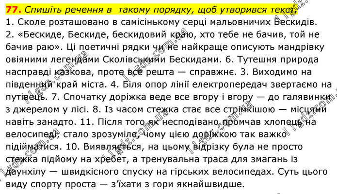 Спишіть речення в такому порядку, щоб утворився текст. 1. Сколе розташовано в самісінькому серці мальовничих Бескидів. 2. «Бескиде, Бескиде, бескидовий краю, хто тебе не бачив, той не бачив раю». Ці поетичні рядки чи не найкраще описують мандрівку овіяними легендами Сколівськими Бескидами. 6. Тутешня природа насправді казкова, проте все решта — справжнє. 3. Виходимо на південний край міста. 4. Біля опор лінії електропередач звертаємо на путівець. 7. Спочатку доріжка веде все вгору і вгору — до галявинки з джерелом у лісі. 8. Із часом стежка стає все стрімкішою — місцями навіть занадто. 11. Після того як несподівано промчав хлопець на велосипеді, стало зрозуміло, чому цією доріжкою так важко підійматися. 10. Виявляється, на цьому відрізку була не просто стежка підйому на хребет, а тренувальна траса для змагань із даунхілу — швидкісного спуску на гірських велосипедах. Суть цього виду спорту проста — з’їхати з гори якнайшвидше.