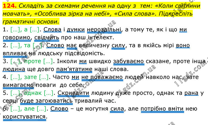 Складіть за схемами речення на одну з тем: «Коли світлини мовчать», «Особлива зірка на небі», «Сила слова». Підкресліть граматичні основи. 1. […], а […]. Слова і думки нероздільні, а тому те, як і що ми говоримо, свідчить про наш інтелект. 2. […], та […]. Слово має величезну силу, та в якійсь мірі воно впливає на людську підсвідомість. 3. […], проте […]. Інколи ми швидко забуваємо сказане, проте інша людина ще довго пам’ятатиме наші слова. 4. […], зате […]. Часто ми не поважаємо людей навколо нас, зате вимагаємо поваги до себе. 5. […], однак […]. Скривдити людину дуже просто, однак та рана у серці буде загоюватись тривалий час. 6. […], але […]. Слово – це могутня сила, але потрібно вміти нею користуватися.