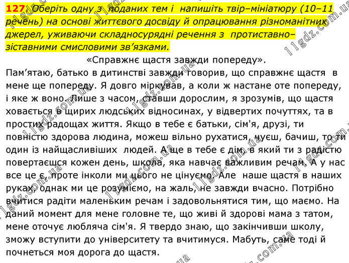 Оберіть одну з поданих тем і напишіть твір–мініатюру (10–11 речень) на основі життєвого досвіду й опрацювання різноманітних джерел, уживаючи складносурядні речення з протиставно–зіставними смисловими зв’язками. «Справжнє щастя завжди попереду». Пам’ятаю, батько в дитинстві завжди говорив, що справжнє щастя в мене ще попереду. Я довго міркував, а коли ж настане оте попереду, і яке ж воно. Лише з часом, ставши дорослим, я зрозумів, що щастя ховається в щирих людських відносинах, у відвертих почуттях, та в простих радощах життя. Якщо в тебе є батьки, сім'я, друзі, ти повністю здорова людина, можеш вільно рухатися, чуєш, бачиш, то ти один із найщасливіших людей. А ще в тебе є дім, в який ти з радістю повертаєшся кожен день, школа, яка навчає важливим речам. А у нас все це є, проте інколи ми цього не цінуємо. Але наше щастя в наших руках, однак ми це розуміємо, на жаль, не завжди вчасно. Потрібно вчитися радіти маленьким речам і задовольнятися тим, що маємо. На даний момент для мене головне те, що живі й здорові мама з татом, мене оточує любляча сім'я. Я твердо знаю, що закінчивши школу, зможу вступити до університету та вчитимуся. Мабуть, саме тоді й почнеться моя дорога до щастя.