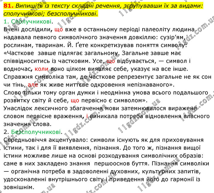 Випишіть із тексту складні речення, згрупувавши їх за видами: сполучникові; безсполучникові. 1. Сполучникові. Вчені дослідили, що вже в останньому періоді палеоліту людина надавала певного символічного значення довкіллю: сузір’ям, рослинам, тваринам. Й. Ґете конкретизував поняття символу: «Часткове завше підлягає загальному. Загальне завше має співвідноситись із частковим. Усе, що відбувається, — символ і водночас, коли воно цілком виявляє себе, указує на все інше. Справжня символіка там, де часткове репрезентує загальне не як сон чи тінь, але як живе миттєве одкровення непізнаваного». Слово тільки тому орган думки і неодмінна умова всього подальшого розвитку світу й себе, що первісно є символом». Унаслідок лексичного збагачення мови затемнювалося виражене словом первісне враження, і виникала потреба відновлення власного значення слова. 2. Безсполучникові. Середньовіччя акцентувало: символи існують як для приховування істини, так і для її виявлення, пізнання. До того ж, пізнання вищої істини можливе лише на основі розкодування символічних образів: саме в них закладено знання першооснов буття. Пізнання символіки — органічна потреба в задоволенні духовних, культурних запитів, удосконаленні внутрішнього світу і приведення його до гармонії із зовнішнім.