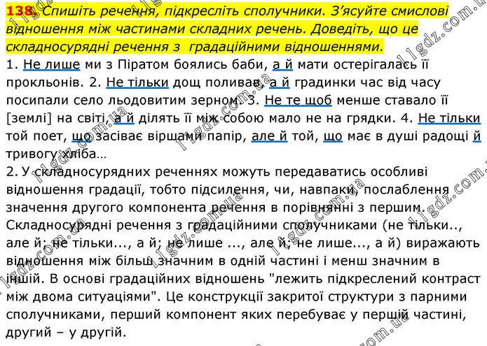 Спишіть речення, підкресліть сполучники. З’ясуйте смислові відношення між частинами складних речень. Доведіть, що це складносурядні речення з градаційними відношеннями. 1. Не лише ми з Піратом боялись баби, а й мати остерігалась її прокльонів. 2. Не тільки дощ поливав, а й градинки час від часу посипали село льодовитим зерном. 3. Не те щоб менше ставало її [землі] на світі, а й ділять її між собою мало не на грядки. 4. Не тільки той поет, що засіває віршами папір, але й той, що має в душі радощі й тривогу хліба… 2. У складносурядних реченнях можуть передаватись особливі відношення градації, тобто підсилення, чи, навпаки, послаблення значення другого компонента речення в порівнянні з першим. Складносурядні речення з градаційними сполучниками (не тільки.., але й; не тільки..., а й; не лише ..., але й; не лише..., а й) виражають відношення між більш значним в одній частині і менш значним в іншій. В основі градаційних відношень "лежить підкреслений контраст між двома ситуаціями". Це конструкції закритої структури з парними сполучниками, перший компонент яких перебуває у першій частині, другий – у другій.
