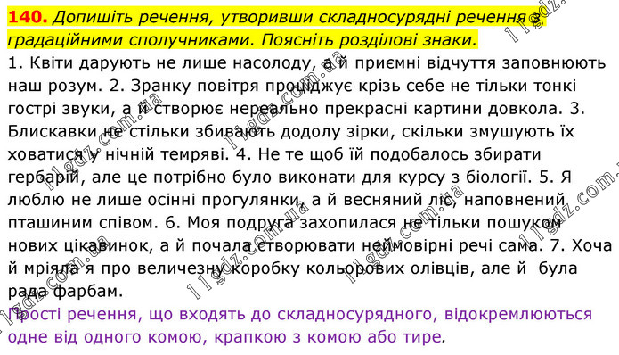 Допишіть речення, утворивши складносурядні речення з градаційними сполучниками. Поясніть розділові знаки. 1. Квіти дарують не лише насолоду, а й приємні відчуття заповнюють наш розум. 2. Зранку повітря проціджує крізь себе не тільки тонкі гострі звуки, а й створює нереально прекрасні картини довкола. 3. Блискавки не стільки збивають додолу зірки, скільки змушують їх ховатися у нічній темряві. 4. Не те щоб їй подобалось збирати гербарій, але це потрібно було виконати для курсу з біології. 5. Я люблю не лише осінні прогулянки, а й весняний ліс, наповнений пташиним співом. 6. Моя подруга захопилася не тільки пошуком нових цікавинок, а й почала створювати неймовірні речі сама. 7. Хоча й мріяла я про величезну коробку кольорових олівців, але й була рада фарбам. Прості речення, що входять до складносурядного, відокремлюються одне від одного комою, крапкою з комою або тире.