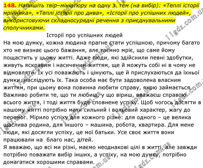 Напишіть твір–мініатюру на одну з тем (на вибір): «Теплі історії мрійника», «Теплі історії про дива», «Історії про успішних людей», використовуючи складносурядні речення з приєднувальними сполучниками. Історії про успішних людей На мою думку, кожна людина прагне стати успішною, причому багато хто не визнає цього бажання, але таємно мріє, що саме йому пощастить у цьому житті. Адже люди, які здійснили певні здобутки, живуть яскравим і насиченим життям, ще й можуть собі ні в чому не відмовляти. Їх усі поважають і цінують, ще й прислухаються да їхньої думки, наслідують їх. Така особа має бути задоволена власним життям, при цьому вона повинна любити справу, якою займається. Важливо робити те, що ти любиш, у що віриш, вважаєш справою всього життя, і тоді життя буде сповнене успіху. Щоб чогось досягти в нашому житті потрібно мати сильний і вольовий характер, жагу до перемог. Мірило успіху для кожного різне: для одного – це велика щаслива родина, для іншого – машина, робота, квартира. Для мене люди, які досягли успіху, це мої батьки. Усе своє життя вони працювали на благо нас, дітей. Я вважаю, що всі ми різні, маємо неоднакові цілі в житті, але завжди потрібно поважати вибір інших, а успіху, на мою думку, потрібно домагатися хорошими справами.