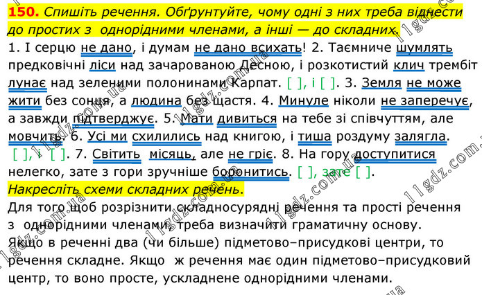 Спишіть речення. Обґрунтуйте, чому одні з них треба віднести до простих з однорідними членами, а інші — до складних. 1. І серцю не дано, і думам не дано всихать! 2. Таємниче шумлять предковічні ліси над зачарованою Десною, і розкотистий клич трембіт лунає над зеленими полонинами Карпат. [ ], і [ ]. 3. Земля не може жити без сонця, а людина без щастя. 4. Минуле ніколи не заперечує, а завжди підтверджує. 5. Мати дивиться на тебе зі співчуттям, але мовчить. 6. Усі ми схилились над книгою, і тиша роздуму залягла. [ ], і [ ]. 7. Світить місяць, але не гріє. 8. На гору доступитися нелегко, зате з гори зручніше боронитись. [ ], зате [ ]. Накресліть схеми складних речень. Для того щоб розрізнити складносурядні речення та прості речення з однорідними членами, треба визначити граматичну основу. Якщо в реченні два (чи більше) підметово–присудкові центри, то речення складне. Якщо ж речення має один підметово–присудковий центр, то воно просте, ускладнене однорідними членами.