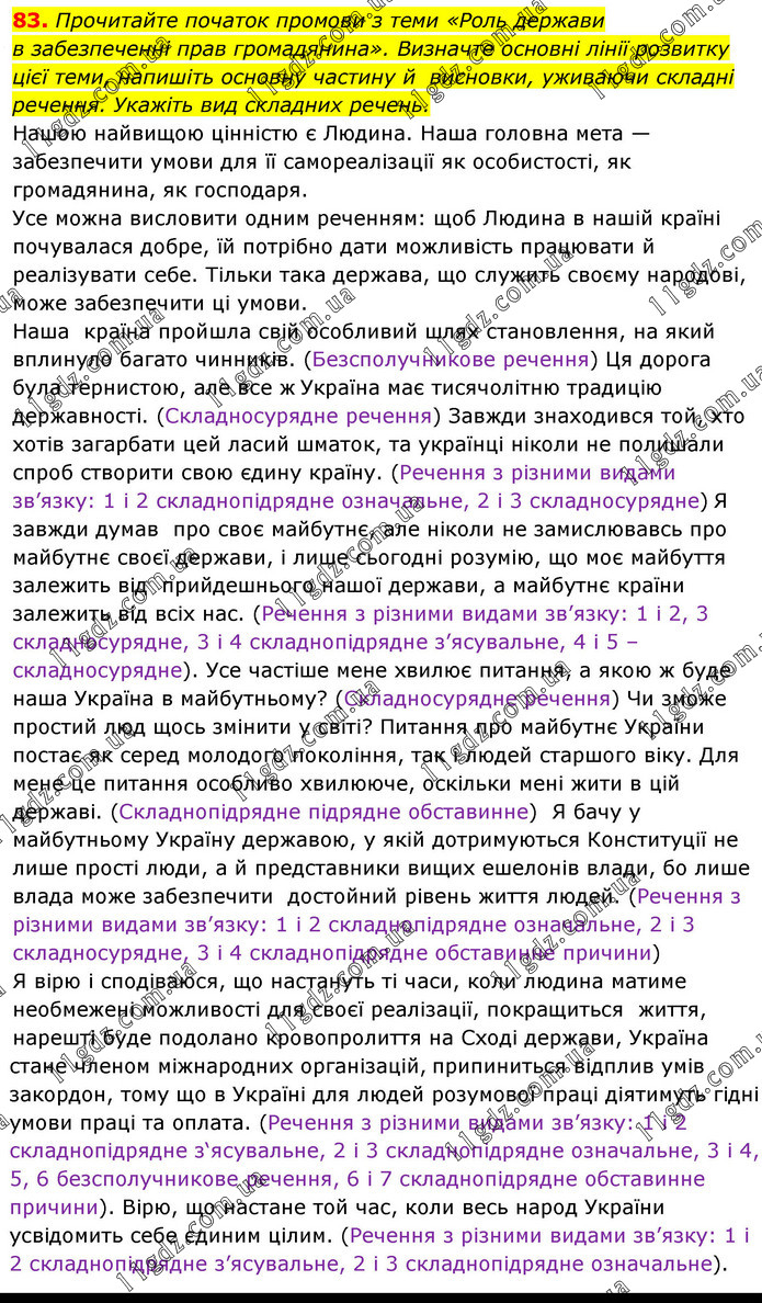 Прочитайте початок промови з теми «Роль держави в забезпеченні прав громадянина». Визначте основні лінії розвитку цієї теми, напишіть основну частину й висновки, уживаючи складні речення. Укажіть вид складних речень. Нашою найвищою цінністю є Людина. Наша головна мета — забезпечити умови для її самореалізації як особистості, як громадянина, як господаря. Усе можна висловити одним реченням: щоб Людина в нашій країні почувалася добре, їй потрібно дати можливість працювати й реалізувати себе. Тільки така держава, що служить своєму народові, може забезпечити ці умови. Наша країна пройшла свій особливий шлях становлення, на який вплинуло багато чинників. (Безсполучникове речення) Ця дорога була тернистою, але все ж Україна має тисячолітню традицію державності. (Складносурядне речення) Завжди знаходився той, хто хотів загарбати цей ласий шматок, та українці ніколи не полишали спроб створити свою єдину країну. (Речення з різними видами зв’язку: 1 і 2 складнопідрядне означальне, 2 і 3 складносурядне) Я завжди думав про своє майбутнє, але ніколи не замислювавсь про майбутнє своєї держави, і лише сьогодні розумію, що моє майбуття залежить від прийдешнього нашої держави, а майбутнє країни залежить від всіх нас. (Речення з різними видами зв’язку: 1 і 2, 3 складносурядне, 3 і 4 складнопідрядне з’ясувальне, 4 і 5 – складносурядне). Усе частіше мене хвилює питання, а якою ж буде наша Україна в майбутньому? (Складносурядне речення) Чи зможе простий люд щось змінити у світі? Питання про майбутнє України постає як серед молодого покоління, так і людей старшого віку. Для мене це питання особливо хвилююче, оскільки мені жити в цій державі. (Складнопідрядне підрядне обставинне) Я бачу у майбутньому Україну державою, у якій дотримуються Конституції не лише прості люди, а й представники вищих ешелонів влади, бо лише влада може забезпечити достойний рівень життя людей. (Речення з різними видами зв’язку: 1 і 2 складнопідрядне означальне, 2 і 3 складносурядне, 3 і 4 складнопідрядне обставинне причини) Я вірю і сподіваюся, що настануть ті часи, коли людина матиме необмежені можливості для своєї реалізації, покращиться життя, нарешті буде подолано кровопролиття на Сході держави, Україна стане членом міжнародних організацій, припиниться відплив умів закордон, тому що в Україні для людей розумової праці діятимуть гідні умови праці та оплата. (Речення з різними видами зв’язку: 1 і 2 складнопідрядне з‘ясувальне, 2 і 3 складнопідрядне означальне, 3 і 4, 5, 6 безсполучникове речення, 6 і 7 складнопідрядне обставинне причини). Вірю, що настане той час, коли весь народ України усвідомить себе єдиним цілим. (Речення з різними видами зв’язку: 1 і 2 складнопідрядне з’ясувальне, 2 і 3 складнопідрядне означальне).
