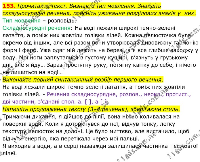 Прочитайте текст. Визначте тип мовлення. Знайдіть складносурядні речення, поясніть уживання розділових знаків у них. Тип мовлення – розповідь. Складносурядні речення: На воді лежали широкі темно-зелені латаття, а поміж них жовтіли голівки лілей. Кожна пелюсточка була окремо від інших, але всі разом вони утворювали дивовижну гармонію форм і фарб. Уже одяг мій лежить на березі, а я все глибше заходжу у воду. Мої ноги заплуталися в густому куширі, в’язнуть у грузькому дні, але я йду… Зараз простягну руку, потягну квітку до себе, і нічого не лишиться на воді… Виконайте повний синтаксичний розбір першого речення. На воді лежали широкі темно-зелені латаття, а поміж них жовтіли голівки лілей. - Речення складносурядне, розпов., неокл., протист., дві частини, з'єднані спол. а. [ ], а [ ]. Напишіть продовження тексту (3–4 речення), зберігаючи стиль. Тримаючи дихання, я дійшов до лілії, вона ніжно коливалася на поверхні води. Коли я доторкнувся до неї, відчув тонку, легку текстуру пелюсток на долоні. Це було миттєво, але вистачило, щоб відчути енергію, яка перетікала через мої пальці. Я виходив з води, а в серці назавжди залишилася частинка тієї жовтої лілеї.