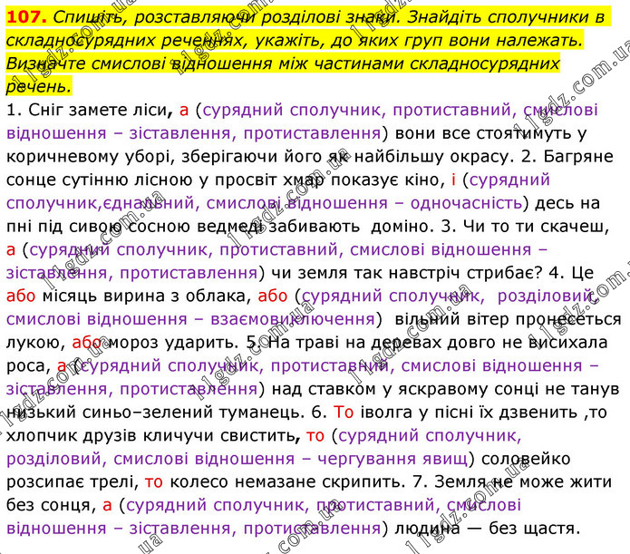 Спишіть, розставляючи розділові знаки. Знайдіть сполучники в складносурядних реченнях, укажіть, до яких груп вони належать. Визначте смислові відношення між частинами складносурядних речень. 1. Сніг замете ліси, а (сурядний сполучник, протиставний, смислові відношення – зіставлення, протиставлення) вони все стоятимуть у коричневому уборі, зберігаючи його як найбільшу окрасу. 2. Багряне сонце сутінню лісною у просвіт хмар показує кіно, і (сурядний сполучник,єднальний, смислові відношення – одночасність) десь на пні під сивою сосною ведмеді забивають доміно. 3. Чи то ти скачеш, а (сурядний сполучник, протиставний, смислові відношення – зіставлення, протиставлення) чи земля так навстріч стрибає? 4. Це або місяць вирина з облака, або (сурядний сполучник, розділовий, смислові відношення – взаємовиключення) вільний вітер пронесеться лукою, або мороз ударить. 5. На траві на деревах довго не висихала роса, а (сурядний сполучник, протиставний, смислові відношення – зіставлення, протиставлення) над ставком у яскравому сонці не танув низький синьо–зелений туманець. 6. То іволга у пісні їх дзвенить ,то хлопчик друзів кличучи свистить, то (сурядний сполучник, розділовий, смислові відношення – чергування явищ) соловейко розсипає трелі, то колесо немазане скрипить. 7. Земля не може жити без сонця, а (сурядний сполучник, протиставний, смислові відношення – зіставлення, протиставлення) людина — без щастя.