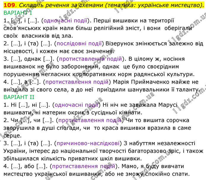 Складіть речення за схемами (тематика: українське мистецтво). ВАРІАНТ I 1. […], і […]. (одночасні події). Перші вишивки на території слов’янських країн мали більш релігійний зміст, і вони оберігали своїх власників від зла. 2. […], і (та) […]. (послідовні події) Візерунок змінюється залежно від місцевості, і кожен має своє значення. 3. […], однак […]. (протиставлення подій). В цілому ж, носіння вишиванок не було забороненим, однак це було своєрідним порушенням негласних корпоративних норм радянської культури. 4. […], а […]. (протиставлення подій) Марія Приймаченко майже не виїздила зі свого села, а до неї приїздили шанувальники її таланту. ВАРІАНТ II 1. Ні […], ні […]. (одночасні події) Ні ніч не заважала Марусі вишивати, ні материн окрик з сусідньої кімнати. 2. Чи […], чи […]. (протиставлення подій) Чи то вишита сорочка зворушила в душі спогади, чи то краса вишивки вразила в саме серце. 3. […], і (та) […]. (причиновонаслідкові) З набуттям незалежності України, інтерес до національної творчості багаторазово зріс, і також збільшилася кількість приватних шкіл вишивки. 4. […], або […]. (протиставлення подій). Мамо, я буду вивчати мистецтво української вишиванки, або не зможу спокійно спати.