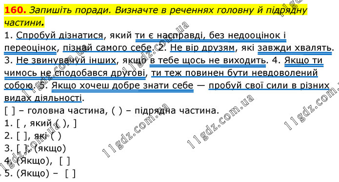 Запишіть поради. Визначте в реченнях головну й підрядну частини. 1. Спробуй дізнатися, який ти є насправді, без недооцінок і переоцінок, пізнай самого себе. 2. Не вір друзям, які завжди хвалять. 3. Не звинувачуй інших, якщо в тебе щось не виходить. 4. Якщо ти чимось не сподобався другові, ти теж повинен бути невдоволений собою. 5. Якщо хочеш добре знати себе — пробуй свої сили в різних видах діяльності. [ ] – головна частина, ( ) – підрядна частина. 1. [ , який ( ), ] 2. [ ], які ( ) 3. [ ], (якщо) 4. (Якщо), [ ] 5. (Якщо) – [ ]