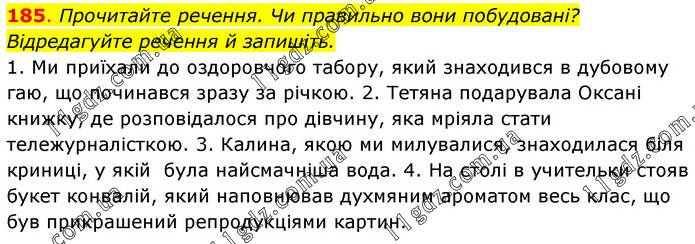 Прочитайте речення. Чи правильно вони побудовані? Відредагуйте речення й запишіть. 1. Ми приїхали до оздоровчого табору, який знаходився в дубовому гаю, що починався зразу за річкою. 2. Тетяна подарувала Оксані книжку, де розповідалося про дівчину, яка мріяла стати тележурналісткою. 3. Калина, якою ми милувалися, знаходилася біля криниці, у якій була найсмачніша вода. 4. На столі в учительки стояв букет конвалій, який наповнював духмяним ароматом весь клас, що був прикрашений репродукціями картин.