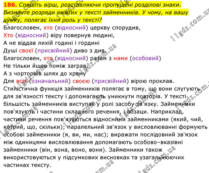 Спишіть вірш, розставляючи пропущені розділові знаки. Визначте розряди вжитих у тексті займенників. У чому, на вашу думку, полягає їхня роль у тексті? Благословен, хто (відносний) церкву спорудив, Хто (відносний) віру повернув людині, А не віддав лихій годині і гордині Душі своєї (присвійний) диво з див. Благословен, хто (відносний) разом з нами (особовий) Не тільки йшов поміж заграв, А з чорториїв шлях до храму Для всіх (означальний) своєю (присвійний) вірою проклав. Стилістична функція займенників полягає в тому, що вони слугують для зв'язності тексту і допомагають уникнути повторів. У тексті більшість займенників виступає у ролі засобу зв'язку. Займенники пов'язують і частини складного речення, і абзаци. Наприклад, частини речення пов'язуються відносними займенниками (який, чий, котрий, що, скільки); паралельний зв'язок у висловлюванні формують особові займенники (я, ви, ми, нас); виражати послідовний зв'язок між одиницями висловлювання допомагають особово–вказівні займенники (він, вона, воно, вони). Займенники також використовуються у підсумкових висновках та узагальнюючих частинах тексту.