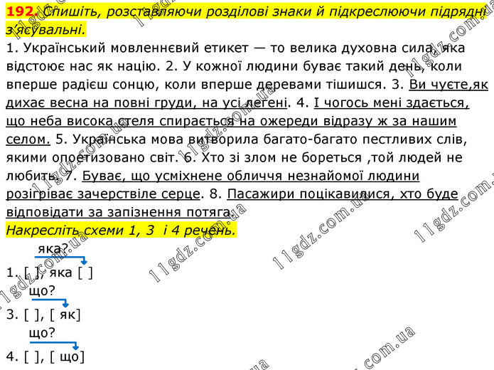 Спишіть, розставляючи розділові знаки й підкреслюючи підрядні з’ясувальні. 1. Український мовленнєвий етикет — то велика духовна сила, яка відстоює нас як націю. 2. У кожної людини буває такий день, коли вперше радієш сонцю, коли вперше деревами тішишся. 3. Ви чуєте,як дихає весна на повні груди, на усі легені. 4. І чогось мені здається, що неба висока стеля спирається на ожереди відразу ж за нашим селом. 5. Українська мова витворила багатобагато пестливих слів, якими опоетизовано світ. 6. Хто зі злом не бореться ,той людей не любить. 7. Буває, що усміхнене обличчя незнайомої людини розігріває зачерствіле серце. 8. Пасажири поцікавилися, хто буде відповідати за запізнення потяга. Накресліть схеми 1, 3 і 4 речень. яка? 1. [ ], яка [ ] що? 3. [ ], [ як] що? 4. [ ], [ що]