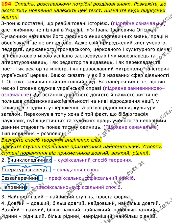 Спишіть, розставляючи потрібні розділові знаки. Розкажіть, до якого типу мовлення належить цей текст. Визначте види підрядних частин. Зпоміж постатей, що реабілітовані історією, (підрядне означальне) але глибинно не пізнані в Україні, ім’я Івана Івановича Огієнка. Сучасники називали його людиною енциклопедичних знань, праці й обов’язку. І це не випадково. Адже свій природжений хист ученого, педагога, державного, громадського, церковного і культурного діяча він однаковою мірою успішно застосовував і як мовознавець та літературознавець, і як редактор та видавець, і як перекладач та поет, і як ректор та міністр, і як православний митрополит та історик української церкви. Важко сказати у якій з названих сфер діяльності І. Огієнко залишив найпомітніший слід. Беззаперечним є те, що він чесно і сповна служив українській справі (підрядне займенниково–означальне). До останніх днів свого довгого й важкого життя не полишав сподвижницької діяльності на ниві відродження нації, у захисті, а згодом в утвердженні та розвої рідної мови, культури загалом. Переконує в тому хоча б той факт, що бібліографія наукових, публіцистичних та художніх праць ученого за неповними даними становить понад тисячу одиниць. (Підрядне означальне) Тип мовлення – розповідь. Визначте спосіб творення виділених слів. З’ясуйте ступінь порівняння прикметника найпомітніший. Утворіть ступені порівняння від прикметників довгий, важкий, рідний. 2. Енциклопедичних – суфіксальний спосіб творення. Літературознавець – складання основ. Беззаперечним – префіксально–суфіксальний спосіб. Неповними – префіксально–суфіксальний спосіб. 3. Найпомітніший – найвищий ступінь, проста форма. 4. Довгий – довший, більш довгий, найдовший, найбільш довгий. Важкий – важчий, більш важкий, найважчий, найбільш важкий. Рідний – рідніший, більш рідний, найрідніший, найбільш рідний.