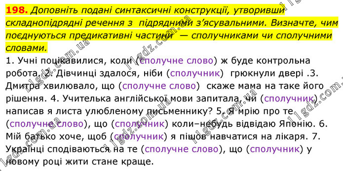 Доповніть подані синтаксичні конструкції, утворивши складнопідрядні речення з підрядними з’ясувальними. Визначте, чим поєднуються предикативні частини — сполучниками чи сполучними словами. 1. Учні поцікавилися, коли (сполучне слово) ж буде контрольна робота. 2. Дівчинці здалося, ніби (сполучник) грюкнули двері .3. Дмитра хвилювало, що (сполучне слово) скаже мама на таке його рішення. 4. Учителька англійської мови запитала, чи (сполучник) написав я листа улюбленому письменнику? 5. Я мрію про те (сполучне слово), що (сполучник) коли–небудь відвідаю Японію. 6. Мій батько хоче, щоб (сполучник) я пішов навчатися на лікаря. 7. Українці сподіваються на те (сполучне слово), що (сполучник) у новому році жити стане краще.