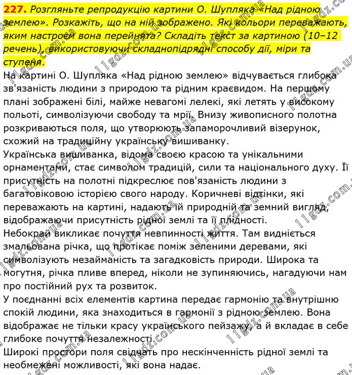 Розгляньте репродукцію картини О. Шупляка «Над рідною землею». Розкажіть, що на ній зображено. Які кольори переважають, яким настроєм вона перейнята? Складіть текст за картиною (10–12 речень), використовуючи складнопідрядні способу дії, міри та ступеня. На картині О. Шупляка «Над рідною землею» відчувається глибока зв'язаність людини з природою та рідним краєвидом. На першому плані зображені білі, майже невагомі лелекі, які летять у високому польоті, символізуючи свободу та мрії. Внизу живописного полотна розкриваються поля, що утворюють запаморочливий візерунок, схожий на традиційну українську вишиванку. Українська вишиванка, відома своєю красою та унікальними орнаментами, стає символом традицій, сили та національного духу. Її присутність на полотні підкреслює пов'язаність людини з багатовіковою історією свого народу. Коричневі відтінки, які переважають на картині, надають їй природній та земний вигляд, відображаючи присутність рідної землі та її плідності. Небокрай викликає почуття невпинності життя. Там видніється змальована річка, що протікає поміж зеленими деревами, які символізують незайманість та загадковість природи. Широка та могутня, річка пливе вперед, ніколи не зупиняючись, нагадуючи нам про постійний рух та розвиток. У поєднанні всіх елементів картина передає гармонію та внутрішню спокій людини, яка знаходиться в гармонії з рідною землею. Вона відображає не тільки красу українського пейзажу, а й вкладає в себе глибоке почуття незалежності. Широкі простори поля свідчать про нескінченність рідної землі та необмежені можливості, які вона надає.