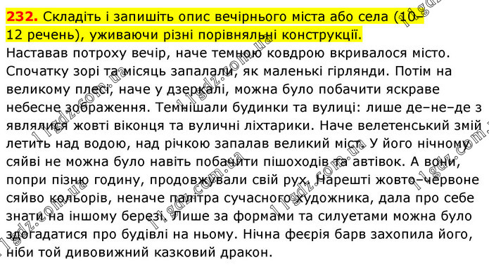 Складіть і запишіть опис вечірнього міста або села (10–12 речень), уживаючи різні порівняльні конструкції. Наставав потроху вечір, наче темною ковдрою вкривалося місто. Спочатку зорі та місяць запалали, як маленькі гірлянди. Потім на великому плесі, наче у дзеркалі, можна було побачити яскраве небесне зображення. Темнішали будинки та вулиці: лише де–не–де з являлися жовті віконця та вуличні ліхтарики. Наче велетенський змій летить над водою, над річкою запалав великий міст. У його нічному сяйві не можна було навіть побачити пішоходів та автівок. А вони, попри пізню годину, продовжували свій рух. Нарешті жовто–червоне сяйво кольорів, неначе палітра сучасного художника, дала про себе знати на іншому березі. Лише за формами та силуетами можна було здогадатися про будівлі на ньому. Нічна феєрія барв захопила його, ніби той дивовижний казковий дракон.