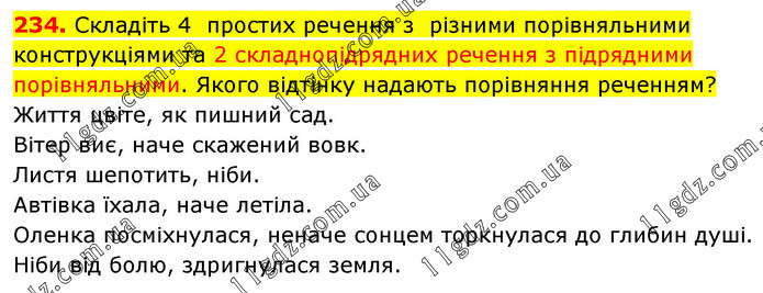 Складіть 4 простих речення з різними порівняльними конструкціями та 2 складнопідрядних речення з підрядними порівняльними. Якого відтінку надають порівняння реченням? Життя цвіте, як пишний сад. Вітер виє, наче скажений вовк. Листя шепотить, ніби. Автівка їхала, наче летіла. Оленка посміхнулася, неначе сонцем торкнулася до глибин душі. Ніби від болю, здригнулася земля.