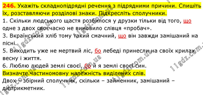 Укажіть складнопідрядні речення з підрядними причини. Спишіть їх, розставляючи розділові знаки. Підкресліть сполучники. 1. Скільки людського щастя розбилося у друзки тільки від того, що одне з двох своєчасно не вимовило слівця «пробач». 3. Вкраїнський хліб тому такий смачний, що він завжди замішаний на пісні. 5. Виходить уже не мертвий ліс, бо лебеді принесли на своїх крилах весну і життя. 6. Люблю людей землі своєї, бо й я землі своєї син. Визначте частиномовну належність виділених слів. Двох – збірний сполучник, скільки – займенник, замішаний – дієприкметник.