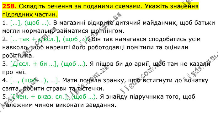 Складіть речення за поданими схемами. Укажіть значення підрядних частин. 1. […], (щоб …). В магазині відкрито дитячий майданчик, щоб батьки могли нормально займатися шоппінгом. 2. [… так + дієсл.], (щоб …). Він так намагався сподобатись усім навколо, щоб нарешті його роботодавці помітили та оцінили робітника. 3. [Дієсл. + би …], (щоб …). Я пішов би до армії, щоб там не казали про неї. 4. […, (щоб …), …]. Мати почала зранку, щоб встигнути до початку свята, робити страви та тістечки. 5. [Імен. + вказ. сл.], (щоб …). Я знайду підручника того, щоб належним чином виконати завдання.