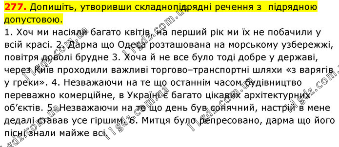 Допишіть, утворивши складнопідрядні речення з підрядною допустовою. 1. Хоч ми насіяли багато квітів, на перший рік ми їх не побачили у всій красі. 2. Дарма що Одеса розташована на морському узбережжі, повітря доволі брудне 3. Хоча й не все було тоді добре у державі, через Київ проходили важливі торгово–транспортні шляхи «з варягів у греки». 4. Незважаючи на те що останнім часом будівництво переважно комерційне, в Україні є багато цікавих архітектурних об’єктів. 5. Незважаючи на те що день був сонячний, настрій в мене дедалі ставав усе гіршим. 6. Митця було репресовано, дарма що його пісні знали майже всі.