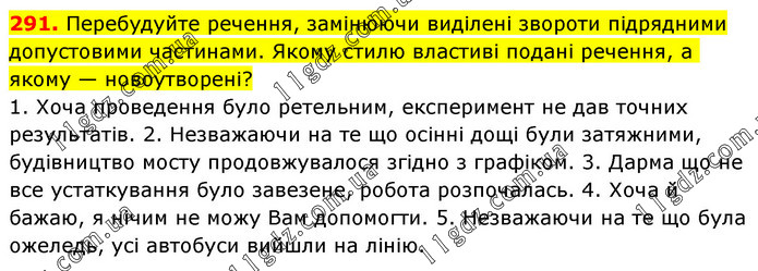 Перебудуйте речення, замінюючи виділені звороти підрядними допустовими частинами. Якому стилю властиві подані речення, а якому — новоутворені? 1. Хоча проведення було ретельним, експеримент не дав точних результатів. 2. Незважаючи на те що осінні дощі були затяжними, будівництво мосту продовжувалося згідно з графіком. 3. Дарма що не все устаткування було завезене, робота розпочалась. 4. Хоча й бажаю, я нічим не можу Вам допомогти. 5. Незважаючи на те що була ожеледь, усі автобуси вийшли на лінію.