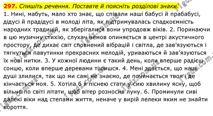 Спишіть речення. Поставте й поясніть розділові знаки. 1. Нині, мабуть, мало хто знає, що співали наші бабусі й прабабусі, дідусі й прадідусі в молоді літа, як підтримувалась спадкоємність народних традицій, як зберігалися вони упродовж віків. 2. Поринаючи в цю музичну стихію, слухач немов опиняється в центрі акустичного простору, де дихає світ сповнений вібрацій і світла, де зав’язуються і тягнуться павутинки прекрасних мелодій, уриваються й зав’язуються їх нові нитки. 3. У кожної людини є такий день, коли вперше радієш сонцю, коли вперше деревами тішишся. 4. Мені здається, що наші душі злилися, так що ми самі не знаємо, де починається твоя і де кінчається моя. 5. Хотіла б я піснею стати у сию хвилину ясну, щоб вільно по світі літати, щоб вітер розносив луну. 6. Проминули сиві далекі віки над степами життя, неначе у вирій лелеки яким не знайти вороття.