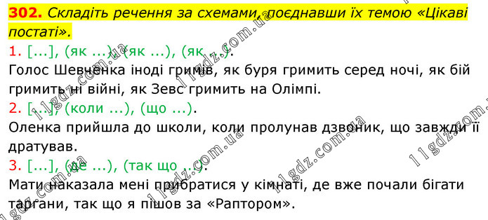 Складіть речення за схемами, поєднавши їх темою «Цікаві постаті». 1. [...], (як ...), (як ...), (як ...). Голос Шевченка іноді гримів, як буря гримить серед ночі, як бій гримить ні війні, як Зевс гримить на Олімпі. 2. [...], (коли ...), (що ...). Оленка прийшла до школи, коли пролунав дзвоник, що завжди її дратував. 3. [...], (де ...), (так що ...). Мати наказала мені прибратися у кімнаті, де вже почали бігати таргани, так що я пішов за «Раптором».