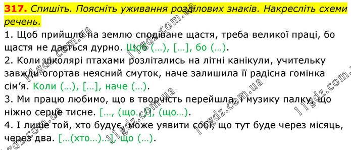 Спишіть. Поясніть уживання розділових знаків. Накресліть схеми речень. 1. Щоб прийшло на землю сподіване щастя, треба великої праці, бо щастя не дається дурно. Щоб (…), […], бо (…). 2. Коли школярі птахами розлітались на літні канікули, учительку завжди огортав неясний смуток, наче залишила її радісна гомінка сім’я. Коли (…), […], наче (…). 3. Ми працю любимо, що в творчість перейшла, і музику палку, що ніжно серце тисне. […, (що…)], (що…). 4. І лише той, хто будує, може уявити собі, що тут буде через місяць, через два. […(хто…)…], що (…).