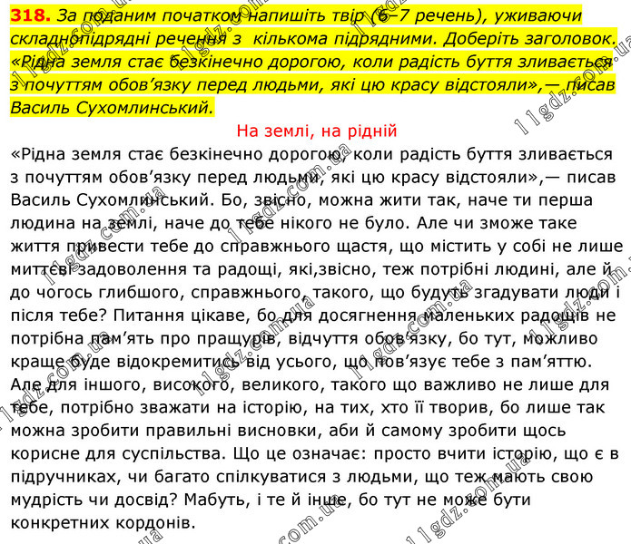 За поданим початком напишіть твір (6–7 речень), уживаючи складнопідрядні речення з кількома підрядними. Доберіть заголовок. «Рідна земля стає безкінечно дорогою, коли радість буття зливається з почуттям обов’язку перед людьми, які цю красу відстояли»,— писав Василь Сухомлинський. На землі, на рідній «Рідна земля стає безкінечно дорогою, коли радість буття зливається з почуттям обов’язку перед людьми, які цю красу відстояли»,— писав Василь Сухомлинський. Бо, звісно, можна жити так, наче ти перша людина на землі, наче до тебе нікого не було. Але чи зможе таке життя привести тебе до справжнього щастя, що містить у собі не лише миттєві задоволення та радощі, які,звісно, теж потрібні людині, але й до чогось глибшого, справжнього, такого, що будуть згадувати люди і після тебе? Питання цікаве, бо для досягнення маленьких радощів не потрібна пам’ять про пращурів, відчуття обов’язку, бо тут, можливо краще буде відокремитись від усього, що пов’язує тебе з пам’яттю. Але для іншого, високого, великого, такого що важливо не лише для тебе, потрібно зважати на історію, на тих, хто її творив, бо лише так можна зробити правильні висновки, аби й самому зробити щось корисне для суспільства. Що це означає: просто вчити історію, що є в підручниках, чи багато спілкуватися з людьми, що теж мають свою мудрість чи досвід? Мабуть, і те й інше, бо тут не може бути конкретних кордонів.