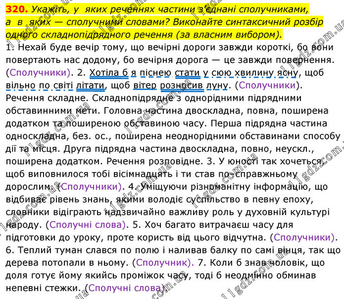 Укажіть, у яких реченнях частини з’єднані сполучниками, а в яких — сполучними словами? Виконайте синтаксичний розбір одного складнопідрядного речення (за власним вибором). 1. Нехай буде вечір тому, що вечірні дороги завжди короткі, бо вони повертають нас додому, бо вечірня дорога — це завжди повернення. (Сполучники). 2. Хотіла б я піснею стати у сюю хвилину ясну, щоб вільно по світі літати, щоб вітер розносив луну. (Сполучники). Речення складне. Складнопідрядне з однорідними підрядними обставинними мети. Головна частина двоскладна, повна, поширена додатком та поширеною обставиною часу. Перша підрядна частина односкладна, без. ос., поширена неоднорідними обставинами способу дії та місця. Друга підрядна частина двоскладна, повно, неускл., поширена додатком. Речення розповідне. 3. У юності так хочеться, щоб виповнилося тобі вісімнадцять і ти став по–справжньому дорослим. (Сполучники). 4. Уміщуючи різноманітну інформацію, що відбиває рівень знань, якими володіє суспільство в певну епоху, словники відіграють надзвичайно важливу роль у духовній культурі народу. (Сполучні слова). 5. Хоч багато витрачаєш часу для підготовки до уроку, проте користь від цього відчутна. (Сполучники). 6. Теплий туман слався по полю і наливав балку по самі вінця, так що дерева потопали в ньому. (Сполучник). 7. Коли б знав чоловік, що доля готує йому якийсь проміжок часу, тоді б неодмінно обминав непевні стежки. (Сполучні слова).