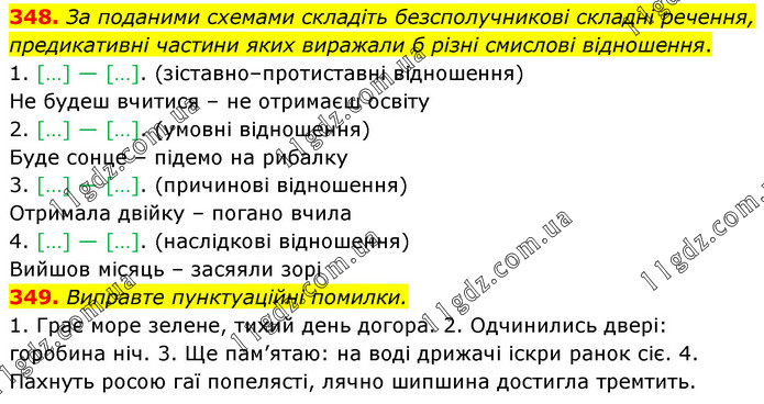 348. За поданими схемами складіть безсполучникові складні речення, предикативні частини яких виражали б різні смислові відношення. 1. […] — […]. (зіставно–протиставні відношення) Не будеш вчитися – не отримаєш освіту 2. […] — […]. (умовні відношення) Буде сонце – підемо на рибалку 3. […] — […]. (причинові відношення) Отримала двійку – погано вчила 4. […] — […]. (наслідкові відношення) Вийшов місяць – засяяли зорі 349. Виправте пунктуаційні помилки. 1. Грає море зелене, тихий день догора. 2. Одчинились двері: горобина ніч. 3. Ще пам’ятаю: на воді дрижачі іскри ранок сіє. 4. Пахнуть росою гаї попелясті, лячно шипшина достигла тремтить.