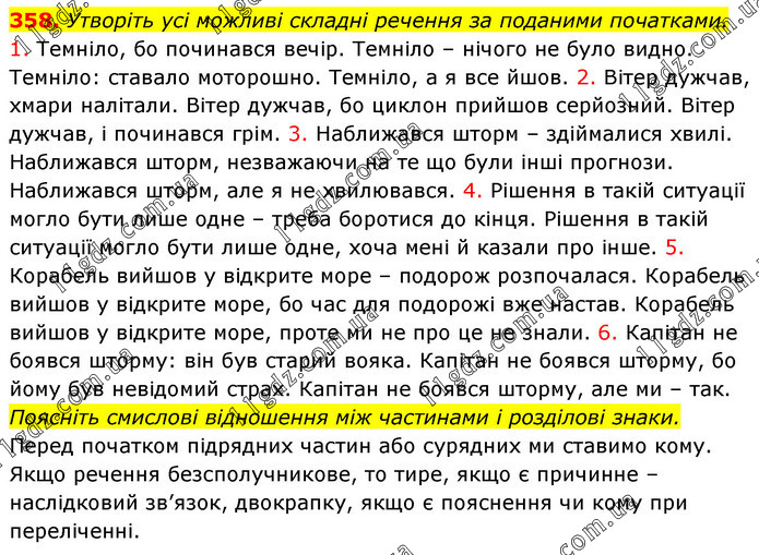 Утворіть усі можливі складні речення за поданими початками. 1. Темніло, бо починався вечір. Темніло – нічого не було видно. Темніло: ставало моторошно. Темніло, а я все йшов. 2. Вітер дужчав, хмари налітали. Вітер дужчав, бо циклон прийшов серйозний. Вітер дужчав, і починався грім. 3. Наближався шторм – здіймалися хвилі. Наближався шторм, незважаючи на те що були інші прогнози. Наближався шторм, але я не хвилювався. 4. Рішення в такій ситуації могло бути лише одне – треба боротися до кінця. Рішення в такій ситуації могло бути лише одне, хоча мені й казали про інше. 5. Корабель вийшов у відкрите море – подорож розпочалася. Корабель вийшов у відкрите море, бо час для подорожі вже настав. Корабель вийшов у відкрите море, проте ми не про це не знали. 6. Капітан не боявся шторму: він був старий вояка. Капітан не боявся шторму, бо йому був невідомий страх. Капітан не боявся шторму, але ми – так. Поясніть смислові відношення між частинами і розділові знаки. Перед початком підрядних частин або сурядних ми ставимо кому. Якщо речення безсполучникове, то тире, якщо є причинне – наслідковий зв’язок, двокрапку, якщо є пояснення чи кому при переліченні.