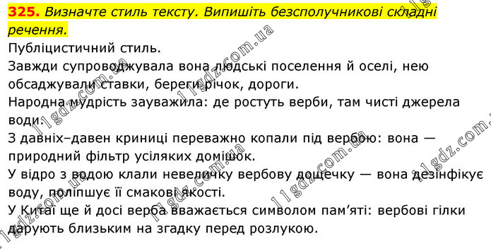 Визначте стиль тексту. Випишіть безсполучникові складні речення. Публіцистичний стиль. Завжди супроводжувала вона людські поселення й оселі, нею обсаджували ставки, береги річок, дороги. Народна мудрість зауважила: де ростуть верби, там чисті джерела води. З давніх–давен криниці переважно копали під вербою: вона — природний фільтр усіляких домішок. У відро з водою клали невеличку вербову дощечку — вона дезінфікує воду, поліпшує її смакові якості. У Китаї ще й досі верба вважається символом пам’яті: вербові гілки дарують близьким на згадку перед розлукою.