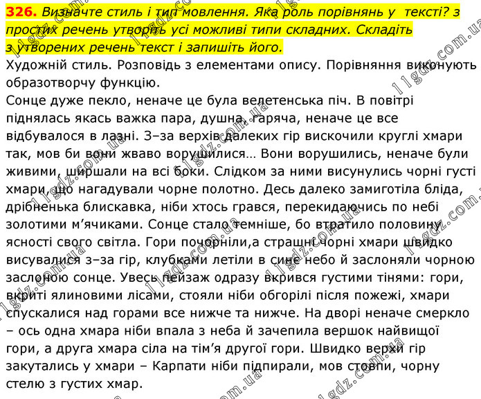 Визначте стиль і тип мовлення. Яка роль порівнянь у тексті? з простих речень утворіть усі можливі типи складних. Складіть з утворених речень текст і запишіть його. Художній стиль. Розповідь з елементами опису. Порівняння виконують образотворчу функцію. Сонце дуже пекло, неначе це була велетенська піч. В повітрі піднялась якась важка пара, душна, гаряча, неначе це все відбувалося в лазні. З–за верхів далеких гір вискочили круглі хмари так, мов би вони жваво ворушилися… Вони ворушились, неначе були живими, ширшали на всі боки. Слідком за ними висунулись чорні густі хмари, що нагадували чорне полотно. Десь далеко замиготіла бліда, дрібненька блискавка, ніби хтось грався, перекидаючись по небі золотими м’ячиками. Сонце стало темніше, бо втратило половину ясності свого світла. Гори почорніли,а страшні чорні хмари швидко висувалися з–за гір, клубками летіли в синє небо й заслоняли чорною заслоною сонце. Увесь пейзаж одразу вкрився густими тінями: гори, вкриті ялиновими лісами, стояли ніби обгорілі після пожежі, хмари спускалися над горами все нижче та нижче. На дворі неначе смеркло – ось одна хмара ніби впала з неба й зачепила вершок найвищої гори, а друга хмара сіла на тім’я другої гори. Швидко верхи гір закутались у хмари – Карпати ніби підпирали, мов стовпи, чорну стелю з густих хмар.