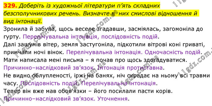 Доберіть із художньої літератури п’ять складних безсполучникових речень. Визначте в них смислові відношення й вид інтонації. Зронила й забула, щось веселе згадавши, засміялась, загомоніла до гурту. Перелічувальна інтонація, послідовність подій. Далі зашумів вітер, земля застугоніла, підкотили вітрові коні гриваті, примчали ночі вінок. Перелічувальна інтонація. Одночасність подій. Мати написала мені письма – я почав про щось здогадуватися. Причинно–наслідковий зв’язок. Інтонація протиставна. Не видно облупленості, іржі на банях, ніч скрадає на ньому всі травми часу. Послідовність подій. Перелічувальна інтонація. Тепер він вже мав обов’язки – його посилали пасти корів. Причинно–наслідковий зв’язок. Уточнення.