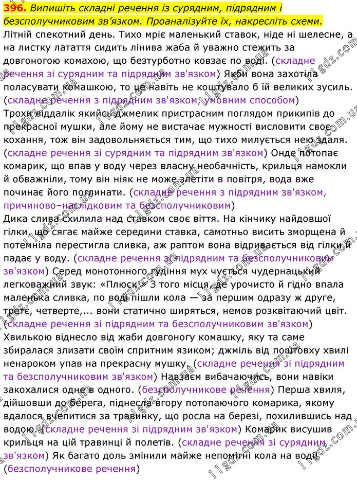 Випишіть складні речення із сурядним, підрядним і безсполучниковим зв’язком. Проаналізуйте їх, накресліть схеми. Літній спекотний день. Тихо мріє маленький ставок, ніде ні шелесне, а на листку латаття сидить лінива жаба й уважно стежить за довгоногою комахою, що безтурботно ковзає по воді. (складне речення зі сурядним та підрядним зв'язком) Якби вона захотіла поласувати комашкою, то це навіть не коштувало б їй великих зусиль. (складне речення з підрядним зв'язком, умовним способом) Трохи віддалік якийсь джмелик пристрасним поглядом прикипів до прекрасної мушки, але йому не вистачає мужності висловити своє кохання, тож він задовольняється тим, що тихо милується нею здаля. (складне речення зі сурядним та підрядним зв'язком) Онде потопає комарик, що впав у воду через власну необачність, крильця намокли й обважніли, тому він ніяк не може злетіти в повітря, вода вже починає його поглинати. (складне речення з підрядним зв'язком, причиново–наслідковим та безсполучниковим) Дика слива схилила над ставком своє віття. На кінчику найдовшої гілки, що сягає майже середини ставка, самотньо висить зморщена й потемніла перестигла сливка, аж раптом вона відривається від гілки й падає у воду. (складне речення зі підрядним та безсполучниковим зв'язком) Серед монотонного гудіння мух чується чудернацький легковажний звук: «Плюск!» З того місця, де урочисто й гідно впала маленька сливка, по воді пішли кола — за першим одразу ж друге, третє, четверте,... вони статично ширяться, немов розквітаючий цвіт. (складне речення зі підрядним та безсполучниковим зв'язком) Хвилькою віднесло від жаби довгоногу комашку, яку та саме збиралася злизати своїм спритним язиком; джміль від поштовху хвилі ненароком упав на прекрасну мушку. (складне речення зі підрядним та безсполучниковим зв'язком) Навзаєм вибачаючись, вони навіки закохалися одне в одного. (безсполучникове речення) Перша хвиля, дійшовши до берега, піднесла вгору потопаючого комарика, якому вдалося вчепитися за травинку, що росла на березі, похилившись над водою. (складне речення зі підрядним зв'язком) Комарик висушив крильця на цій травинці й полетів. (складне речення зі сурядним зв'язком) Як багато доль змінили майже непомітні кола на воді! (безсполучникове речення)