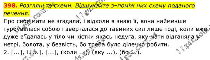 Розгляньте схеми. Відшукайте з–поміж них схему поданого речення. Про себе мати не згадала, і відколи я знаю її, вона найменше турбувалася собою і зверталася до таємних сил лише тоді, коли вже дуже в’їдалась у тіло чи кістки якась недуга, яку мати відганяла у нетрі, болота, у безвість, бо треба було ділечко робити. 2. [...], і [...], [...], (коли ...), (яку ...), (бо ...).