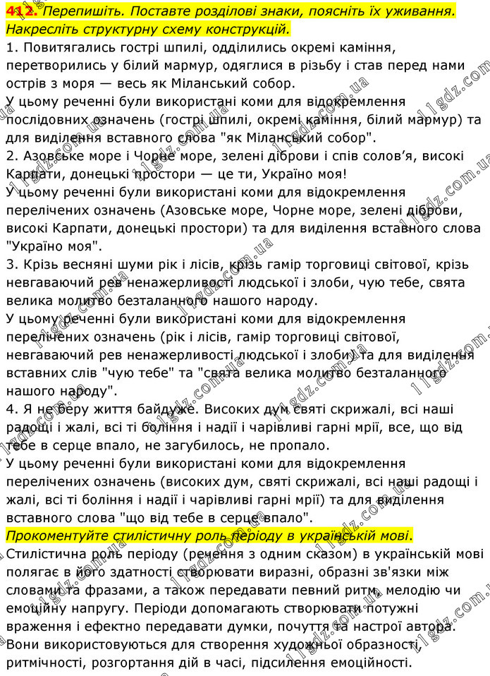 Перепишіть. Поставте розділові знаки, поясніть їх уживання. Накресліть структурну схему конструкцій. 1. Повитягались гострі шпилі, одділились окремі каміння, перетворились у білий мармур, одяглися в різьбу і став перед нами острів з моря — весь як Міланський собор. У цьому реченні були використані коми для відокремлення послідовних означень (гострі шпилі, окремі каміння, білий мармур) та для виділення вставного слова "як Міланський собор". 2. Азовське море і Чорне море, зелені діброви і спів солов’я, високі Карпати, донецькі простори — це ти, Україно моя! У цьому реченні були використані коми для відокремлення перелічених означень (Азовське море, Чорне море, зелені діброви, високі Карпати, донецькі простори) та для виділення вставного слова "Україно моя". 3. Крізь весняні шуми рік і лісів, крізь гамір торговиці світової, крізь невгаваючий рев ненажерливості людської і злоби, чую тебе, свята велика молитво безталанного нашого народу. У цьому реченні були використані коми для відокремлення перелічених означень (рік і лісів, гамір торговиці світової, невгаваючий рев ненажерливості людської і злоби) та для виділення вставних слів "чую тебе" та "свята велика молитво безталанного нашого народу". 4. Я не беру життя байдуже. Високих дум святі скрижалі, всі наші радощі і жалі, всі ті боління і надії і чарівливі гарні мрії, все, що від тебе в серце впало, не загубилось, не пропало. У цьому реченні були використані коми для відокремлення перелічених означень (високих дум, святі скрижалі, всі наші радощі і жалі, всі ті боління і надії і чарівливі гарні мрії) та для виділення вставного слова "що від тебе в серце впало". Прокоментуйте стилістичну роль періоду в українській мові. Стилістична роль періоду (речення з одним сказом) в українській мові полягає в його здатності створювати виразні, образні зв'язки між словами та фразами, а також передавати певний ритм, мелодію чи емоційну напругу. Періоди допомагають створювати потужні враження і ефектно передавати думки, почуття та настрої автора. Вони використовуються для створення художньої образності, ритмічності, розгортання дій в часі, підсилення емоційності.