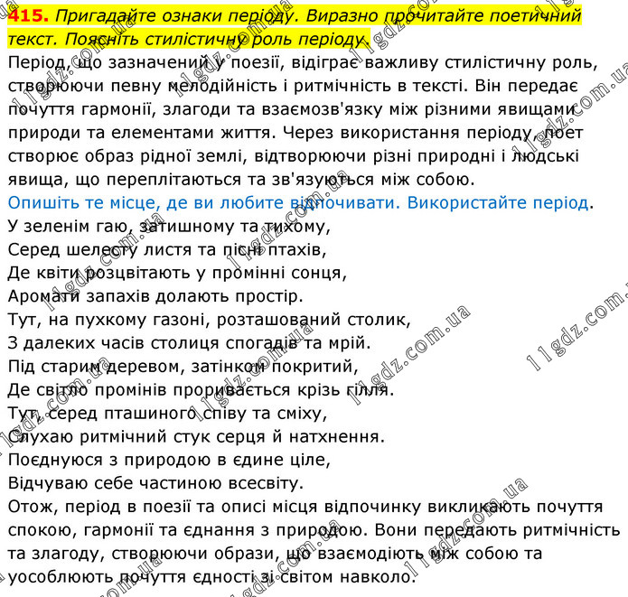 Пригадайте ознаки періоду. Виразно прочитайте поетичний текст. Поясніть стилістичну роль періоду. Період, що зазначений у поезії, відіграє важливу стилістичну роль, створюючи певну мелодійність і ритмічність в тексті. Він передає почуття гармонії, злагоди та взаємозв'язку між різними явищами природи та елементами життя. Через використання періоду, поет створює образ рідної землі, відтворюючи різні природні і людські явища, що переплітаються та зв'язуються між собою. Опишіть те місце, де ви любите відпочивати. Використайте період. У зеленім гаю, затишному та тихому, Серед шелесту листя та пісні птахів, Де квіти розцвітають у промінні сонця, Аромати запахів долають простір. Тут, на пухкому газоні, розташований столик, З далеких часів столиця спогадів та мрій. Під старим деревом, затінком покритий, Де світло промінів проривається крізь гілля. Тут, серед пташиного співу та сміху, Слухаю ритмічний стук серця й натхнення. Поєднуюся з природою в єдине ціле, Відчуваю себе частиною всесвіту. Отож, період в поезії та описі місця відпочинку викликають почуття спокою, гармонії та єднання з природою. Вони передають ритмічність та злагоду, створюючи образи, що взаємодіють між собою та уособлюють почуття єдності зі світом навколо.