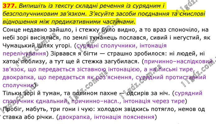 Випишіть із тексту складні речення із сурядним і безсполучниковим зв’язком. З’ясуйте засоби поєднання та смислові відношення між предикативними частинами. Сонце недавно зайшло, і стежку було видно, а то враз споночіло, на небі зорі висіялися, по землі туманець послався, сивий і негустий, як Чумацький Шлях угорі. (сурядні сполучники, інтонація перелічування) Зірвався я бігти — страшно зробилося: ні людей, ні хаток поблизу, а тут ще й стежка загубилася. (причинно–наслідковий зв’язок, що передається зіставною інтонацією, а на письмі тире, двокрапка, що передається як роз’яснення, сурядний протиставний сполучник) Тільки зорі й туман, та полином пахне — одсирів за ніч. (сурядний сполучник єднальний, причинно–насл., інтонація через тире) Пробіг, мабуть, три гони і чую: холодом звідкись потягло, немов од ставка або річки. (двокрапка, інтонація пояснення)